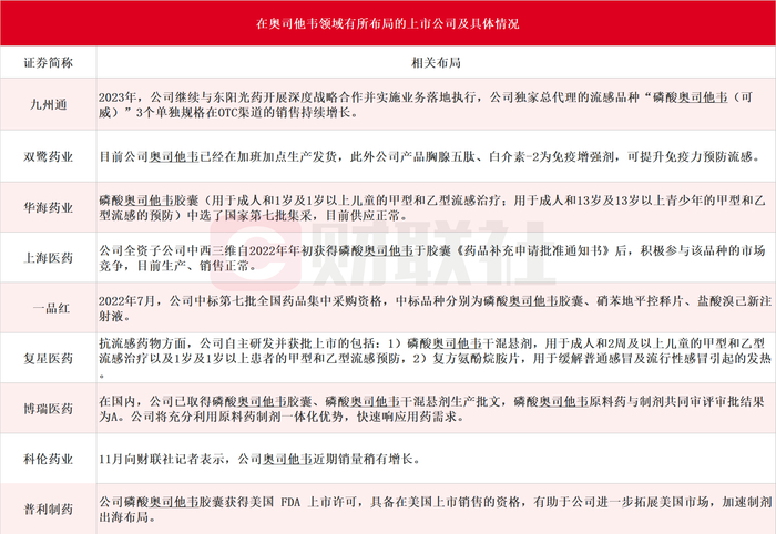 据财联社不完全统计,在奥司他韦领域有所布局的A股上市公司包括九州通、双鹭药业、华海药业、上海医药、一品红、复星医药、博瑞医药、科伦药业和普利制药等,具体情况如下: