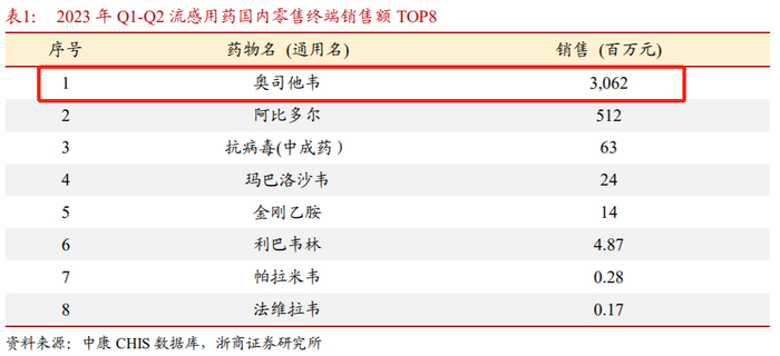 长城国瑞证券胡晨曦等人12月6日研报指出,每年在季节性流感前,不少药店都会储备奥司他韦这类流感药物。但今年多种呼吸道疾病叠加,同时奥司他韦胶囊为集采药物,优先供应院内,院外零售可能出现短期的供不应求情况。浙商证券孙建等人11月26日研报指出,2023H1国内流感用药零售端销售超过35亿元,其中奥司他韦占主要地位。