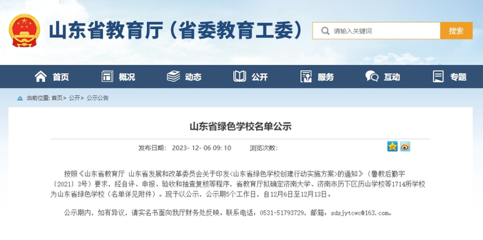 山东省绿色学校名单公示