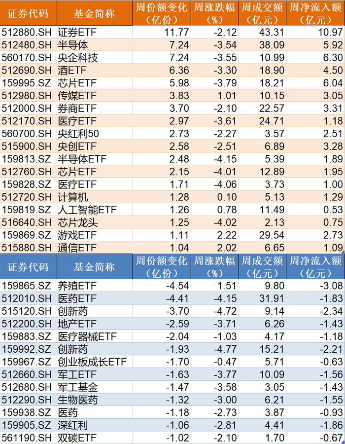 行业主题上看,证券、半导体、央企科技相关ETF被资金看好,而养殖、医药ETF被资金抛售。
