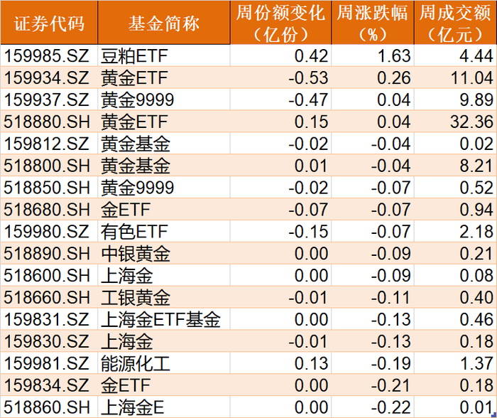 商品ETF本周涨跌互现,除豆粕ETF上涨1.63%外,其余品种涨跌幅均在1%以内。