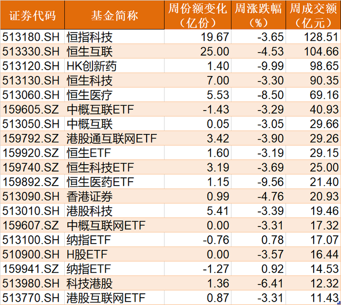 跨境ETF本周成交额超过10亿元的有19只,其中恒指科技、恒生互联等ETF周成交额突破100亿元。从市场表现看,HK创新药、恒生医药ETF跌超9%,纳指ETF小幅上涨。