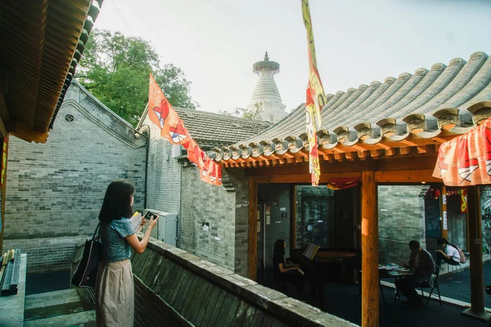 于是,这里成了一处可以消磨时光的场所。拍照之余,你可以进入妙应寺博物馆,近距离观看它,学习它的历史与建筑学知识,也可以寻一处咖啡馆,上到二层天台,品鉴着豆子,越过胡同儿大杂院青灰色的屋顶,远观它的倩影,听听鸽哨与风铃声。