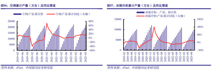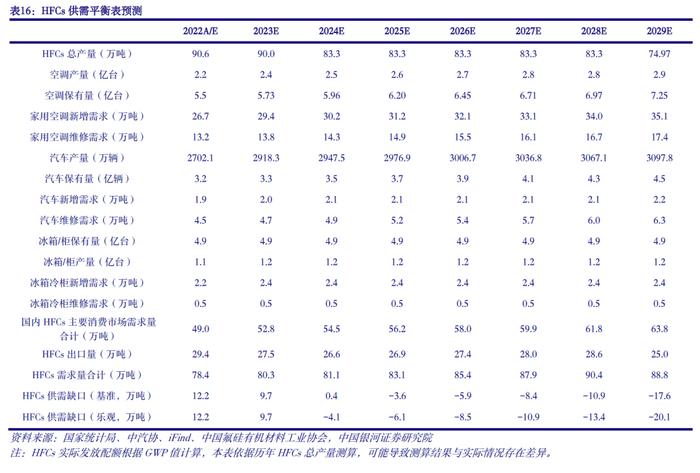 需求端:下游产业逐渐回暖,HFCs需求有望稳健增长。家用空调是含氟制冷剂最大的消费市场,冰箱冷柜、汽车空调次之。2020-2022年基准年期间,受全球新冠疫情、企业生产开工及物流运输阶段性受限等因素影响,我国空调、汽车以及冰箱冷柜产量增速均出现了不同程度放缓,一定程度上拖累了我国制冷剂市场需求。2023年以来随着宏观经济回暖、消费复苏、企业恢复正常运行,我国汽车、空调、冰箱冷柜等下游产业正逐渐回暖。2023年1-10月,我国汽车、空调、冰箱冷柜产量分别为2401.6万辆、2.1亿台、1.0亿台,分别同比增长8.0%、12.4%、11.5%。目前保交楼、促消费等政策仍在持续发力,预计2024年汽车、空调、冰箱冷柜产量有望保持正向增长,进而为制冷剂贡献需求增量。同时随终端产品保有量增加,制冷剂刚性维保需求占比有望逐步提升。整体来看,HFCs需求有望在中长期内稳健增长。