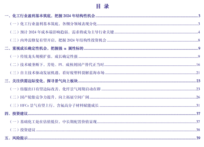 把握2024年化工行业结构性投资机会。随着各项政策落地显效,将为我国经济发展提供有力支撑,2024年我国经济动能有望进一步增强。内需方面,稳增长政策持续发力,下游终端产业修复动能有望逐步转强;外需方面,欧美加息周期有望结束,海外补库需求启动在即,我国出口有望边际改善。我们认为,当前化工行业盈利基本完成筑底;在2024年油价重心稍有回落预期下,成本端将不再是左右行业盈利的关键;在内外需修复共振、主动补库存行情下,2024年化工整体景气度有望上行,存在结构性机会;建议重点把握成长确定性机会,以及关注供需边际变化带来的景气上行机会。