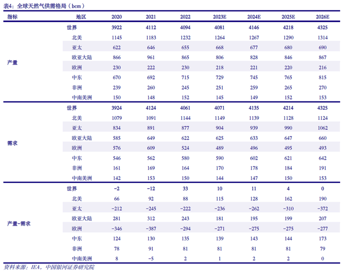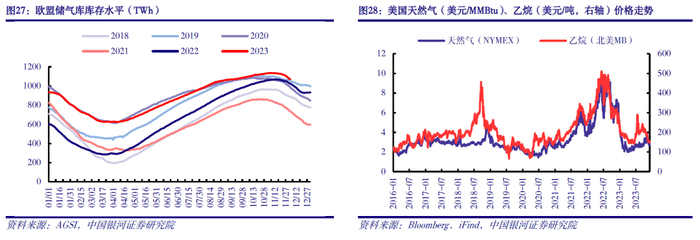 天然气供需紧张局势缓解,预计2024年乙烷价格在历史正常区间运行。从历史走势来看,乙烷价格与天然气价格走势密切关联。2022年受欧洲能源危机影响,国际天然气价格大幅上涨,间接推升乙烷价格。在暖冬天气、工业需求疲软、天然气存储设施库存水平居历史高位等因素共振影响下,欧洲天然气价格高位回落,乙烷价格亦回落至往年正常水平。截至12月4日,美国乙烷价格为148美元/吨,较年初、去年同期分别下降36.8%、47.8%。我们认为,2024年全球天然气供需相对平衡,同时目前欧洲储气库充足率接近历史上限,预计2024年天然气价格有望平稳运行,难以复制2022年暴涨行情,因而预期乙烷价格2024年将在历史正常区间运行。一方面,全球天然气需求有望维持增长,但增速或放缓。IEA预计,中长期全球天然气需求增速有望从2017-2021年的2.5%放缓至2022-2026年的1.6%。其中,2024年全球天然气消费量预计为4135bcm,同比增长1.6%。另一方面,全球天然气供应相对充足,供需预计相对平衡。2024年全球天然气供应量有望至4146bcm,略高于需求量。此外,欧洲是全球主要天然气净进口地区之一,目前欧盟天然气储气库充足率93.9%,储气量占全年总需求28.5%,可用约104天。