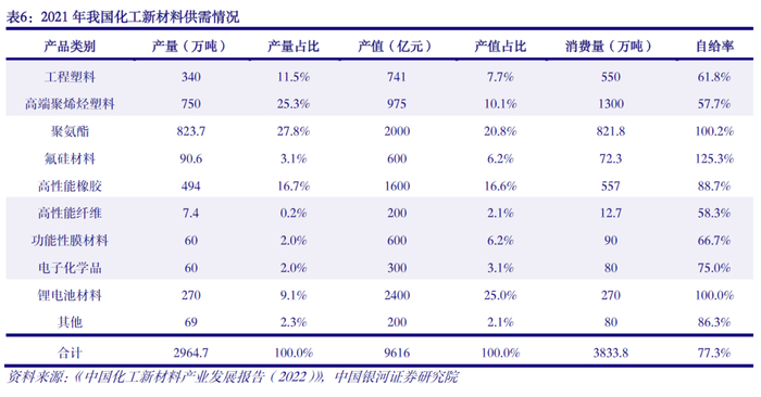 新材料需求空间广阔,创新驱动优质龙头长期成长。2021年我国化工新材料消费量3834万吨,预计2025年我国化工新材料消费量将超5700万吨,对应2021-2025年年均复合增长率10%左右。2021年我国化工新材料自给率为77.3%,高端化工新材料如高端聚烯烃、专用树脂、特种工程塑料、高端膜材料等产品仍然以进口为主。随着光伏、风电、新能源汽车、VR/AR 等战略性新兴产业的高速发展对化工新材料的需求不断提高,产业迎来新的发展机遇期。考虑到化工新材料技术壁垒极高、且进口替代空间较大,拥有强大研发实力的领军企业有望率先享受行业红利。