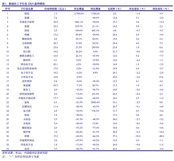 23Q3化工子行业盈利表现分化。在基础化工33个细分子行业中,从归母净利润指标来看,23Q3归母净利润同比提升和下降的子行业比例分别为45.5%和54.5%;环比提升和下降的比例分别为42.4%和57.6%。同比来看,氨纶、绵纶、日用化学品(同比扭亏为盈)、复合肥、涤纶等子行业涨幅居前;环比来看,绵纶、氯碱(环比扭亏为盈)、其他化学原料、氮肥、涤纶等子行业涨幅居前。从毛利率指标来看,23Q3毛利率同比提升和下降的子行业比例分别为27.3%和72.7%;环比提升和下降的比例分别为51.5%和48.5%。同比来看,日用化学品、氨纶、轮胎、合成树脂、粘胶等子行业毛利率抬升幅度居前;环比来看,纯碱、合成树脂、氮肥、其他化学原料、氯碱等子行业毛利率抬升幅度居前。