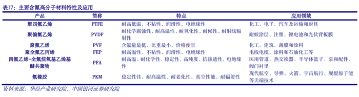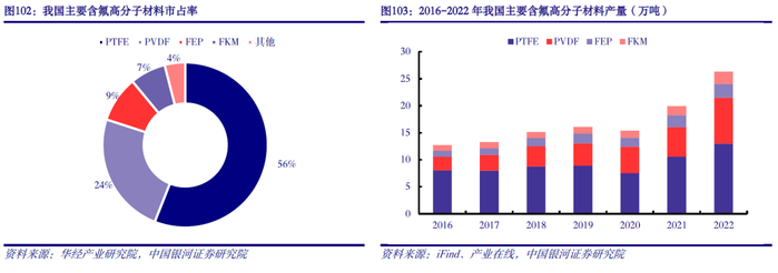 含氟高分子材料细分品类众多,市场规模稳健增长。现阶段较为常见的含氟高分子材料包括聚四氟乙烯(PTFE)、聚偏氟乙烯(PVDF)、聚氟乙烯(PVF)、聚全氟乙丙烯(FEP)、四氟乙烯-全氟烷氧基乙烯基醚共聚物(PFA)以及氟橡胶(FKM)等。受益于下游新兴产业发展提速,近年来含氟高分子材料实现了快速稳定发展。以主流含氟高分子材料PTFE、PVDF和FKM为例,2022年我国三者合计产量为26.3万吨,同比增长32.1%,2016-2022年年均复合增速约12.9%。当前随终端新兴产业持续发展,对于含氟高分子材料等上游核心原材料的性能要求不断提升,含氟高分子材料的应用领域也在不断拓宽。长远来看,含氟高分子材料市场具备稳健增长动能。