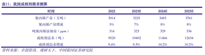 聚丙烯产量提升叠加高性能化趋势,促进成核剂需求稳步增长。统计数据显示,2017-2022年,我国成核剂需求量从5300吨增长至9520吨,年均复合增速达12.4%。我国成核剂需求增长,一方面受益于国内聚丙烯产能扩张带来产量的提升,另一方面受益于消费者对高性能聚丙烯需求的提升。2017-2022年,我国聚丙烯产能、产量持续增长,对应年均复合增速分别为9.6%和8.8%,同期成核剂需求增速高于聚丙烯产能及产量增速,表明国内聚丙烯生产的结构性变化,高性能聚丙烯占比逐步提升。考虑到我国聚丙烯产量持续提升,以及对高性能产品需求增加带来成核剂添加量提升,我们对成核剂未来需求进行了测算,预计未来我国成核剂需求将以年均10%左右的增速增长,至2025年需求有望突破12000吨。