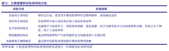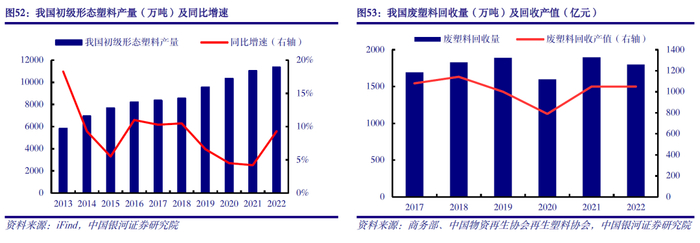 回收再利用是废塑料处理的重要发展方向。现阶段,全球废塑料主要处理方案为填埋和焚烧。但填埋占地面积大,会导致土壤二次污染,影响植物健康发展;焚烧会产生有毒气体二噁英,对环境造成污染,同时焚烧过程也是塑料全生命周期过程中碳排放的主要环节。据《中国塑料行业绿色低碳发展研究报告》,假设废塑料末端处理方式全部为焚烧,则我国每吨塑料生产、消耗、垃圾管理的平均碳排放量为5.2吨CO2,其中焚烧环节的碳排放量为2.7吨CO2/吨塑料。相比之下,废塑料回收再利用可以有效减少环境污染、保持生态平衡、降低碳排放,符合绿色低碳和循环经济的要求,是未来废塑料处理的重要发展方向。目前我国废塑料回收率约为31%,处于全球领先水平。2022年我国废塑料回收量1800万吨,同比下降5.3%;回收产值为1050亿元,较2021年持平,得益于部分再生塑料产品价格上涨。预计到2030年,我国废塑料回收率将提高至45%-50%,碳排放减少量将达到1.8亿吨。