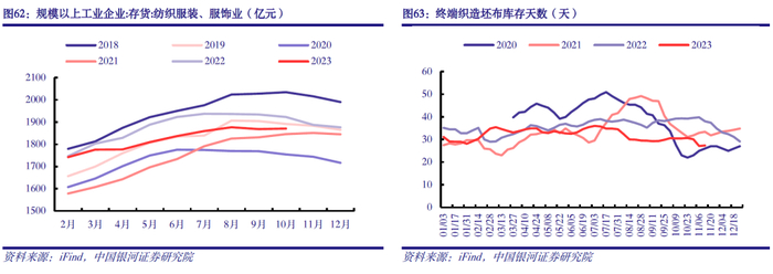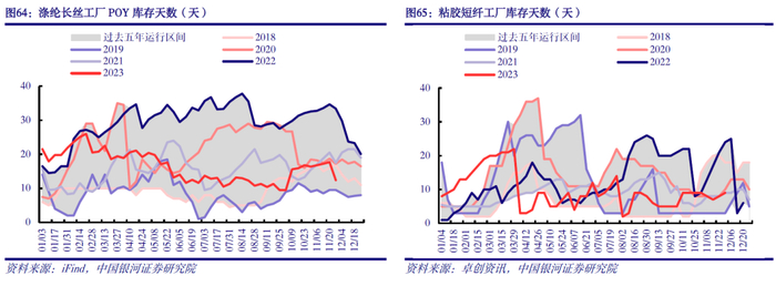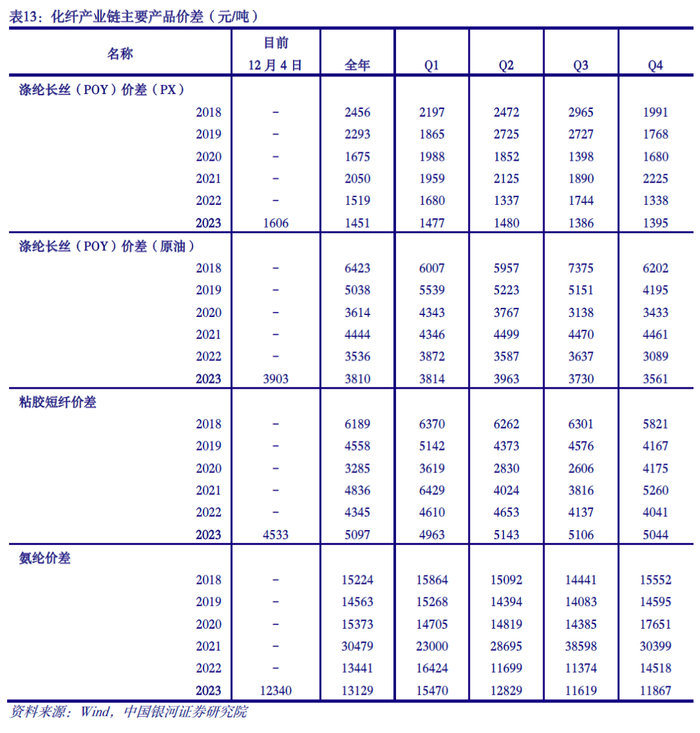 下游需求驱动下2024年盈利改善弹性较大。从终端来看,截至10月底,规模以上工业企业纺织服装、服饰业存货1870.2亿元,较过去五年同期处于中性水平。织造企业处于化纤产业链后端环节,当前织造企业坯布库存天数为27.4天,处于历史同期低位。涤纶长丝工厂POY、FDY、DTY库存天数分别为12.4、17.5和23.5天,粘胶短纤工厂库存天数为9天,氨纶工厂库存天数为44天;除氨纶工厂库存天数较高外,涤纶长丝、粘胶短纤工厂库存天数均处历史同期中等偏低水平。我们认为,需求驱动下2024年盈利改善弹性较大。一方面,我国纺织服装需求有望持续增长。内需层面,随着国内稳增长政策持续发力,国内纺织服装消费有望持续向好;外需层面,海外补库需求有望启动,纺服出口有望迎来边际改善。另一方面,当前化纤产业链各主要环节库存水平均处于历史中性水平,且化纤产业链多数产品价差处于历史底部区域。在当前库存水平下,随着终端需求启动,2024年化纤盈利改善弹性可期。