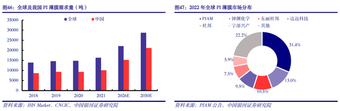 海外企业高度垄断,我国进口替代空间广阔。目前全球高性能PI薄膜市场主要被杜邦、钟渊化学、PIAM等美日韩企业高度垄断。据PIAM数据显示,2022年全球PI薄膜市场CR5约70.9%。我国是全球PI薄膜主要消费国,据IHS、CNCIC数据显示,2021年我国PI薄膜需求量约1.01万吨,全球需求量约1.63万吨,我国PI薄膜需求量全球占比超60%。预计到2030年,我国PI薄膜需求量将突破2万吨,2021-2030年均复合增速8.6%,在全球消费占比也将进一步提升至70%以上。目前我国已有少量企业通过自主研发或进口产线具备量产高性能PI薄膜的能力。但由于我国PI薄膜相关生产研发起步较晚,多数企业现有生产装置及技术难以满足下游对于PI薄膜的高性能诉求,绝大部分高性能PI薄膜需求仍需依赖进口,甚至柔性显示用CPI薄膜等超高附加值细分品类需100%依赖进口,国产替代空间非常广阔。未来随着国内PI薄膜产能扩张和高性能化发展,我国PI薄膜进口依赖度有望逐步下降。