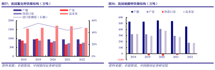 我国钾盐资源储量有限,钾肥高度依赖进口。目前我国作为农业生产大国,对钾肥需求量位居全球第一,约占全球总需求量25%。但我国钾盐资源匮乏,钾盐是我国紧缺的战略性大宗矿产之一,钾盐及钾肥现有产能尚不能满足我国农业需求,对外依存度长期居高不下。据卓创资讯数据显示,2022年我国氯化钾总需求量约1591万吨,净进口量约767万吨,进口依赖度高达48.2%。我国现已将钾肥列入商业储备范围,并鼓励通过“走出去”开发境外钾盐资源解决我国钾肥短缺问题。长远来看,开发境外钾盐资源、增强钾肥境外储备,对我国农业发展及保障粮食安全具有重要战略意义。
