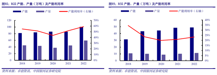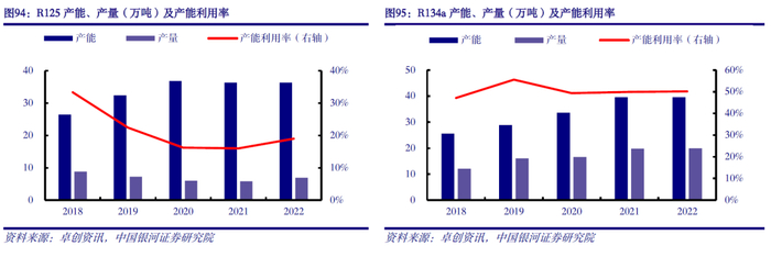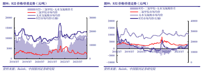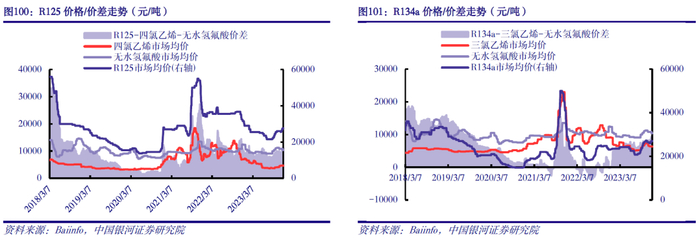 供给端:随配额管理方案实施,HFCs供应有望收紧。2021年前后我国已基本完成HFCs产能扩张。据卓创资讯数据显示,2022年我国R32、R125、R134a等主流HFCs品类产能利用率均在50%及以下水平,行业产能明显过剩。同时,在2020-2022年基准年限期间,企业为抢占配额有意让利倾销HFCs,一定程度上压制了HFCs盈利空间。目前基准年限已告一段落,各企业2024年生产及使用配额即将发放。在配额约束下,企业之间的“价格战”无需继续,2024年HFCs供应将根据配额管理方案有序供应。