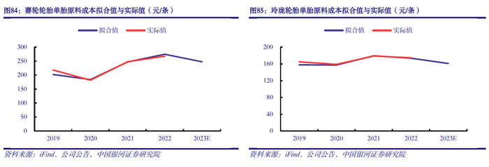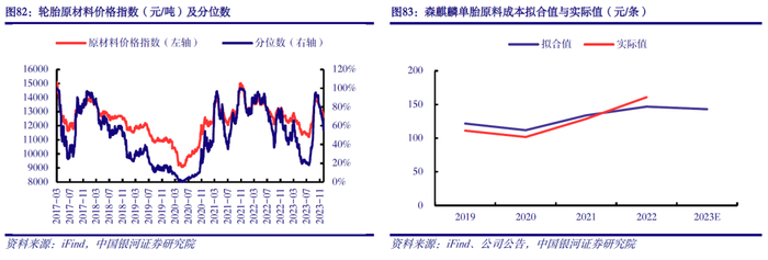 轮胎原料成本压力释放,需求支撑下盈利能力有望维持较高水平。截至12月4日,天然橡胶、丁苯橡胶、顺丁橡胶、炭黑年内均价分别为11008、11841、11489、10212元/吨,同比分别下降7.1%、1.6%、14.0%、6.6%。由于轮胎主要原材料价格走势存在阶段性分化,为反映轮胎原料综合成本变化,我们依托天然橡胶、合成橡胶、炭黑、钢丝帘线、橡胶助剂等产品价格,构建了轮胎原料价格指数。截至2023年12月4日,该指数为12639元/吨,处于2017年3月以来55%的历史分位数水平,较9月下旬95%的历史分位数水平明显下降。此外,我们拟合了国内部分轮胎企业单胎原材料成本,数据显示,随着主要原材料价格的回落,轮胎企业原料成本压力释放,需求支撑下盈利能力有望维持较高水平。