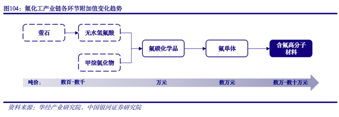 含氟高分子材料高附加值,氟化工企业正加速布局。含氟高分子材料位于产业链中下游环节,生产流程复杂且精密,产品附加值显著高于无水氢氟酸、含氟制冷剂等中上游产品。由于部分氟单体难以运输,为节约成本企业大多选择自主生产氟单体,进而合成含氟高分子材料。近年来已有诸多传统氟化工企业凭借自身原材料优势及多年技术积累,加大力度布局含氟高分子材料,以寻求产业转型升级。未来随着含氟高分子材料产能持续释放,一体化程度更高、产品矩阵更丰富的氟化工企业综合竞争力将愈发突出。