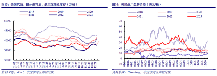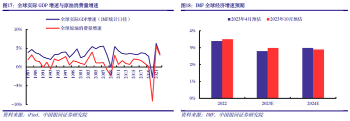 需求端,受全球经济衰退预期影响,原油消费增速预计放缓,需求端仍将压制油价上行高度。短期来看,随着美国夏季出行高峰的结束,汽油需求走弱,使得成品油季节性去库临近尾声,裂解价差大幅回落,原油消费或进入季节性淡季。历史数据显示,全球原油消费增速与全球实际GDP增速呈现明显的正相关性。据10月IMF最新报告显示,为降低通胀而收紧的货币政策预计将使未来经济活动降温,全球经济增速预计从2022年3.5%下行至2023年3.0%、2024年2.9%。EIA、IEA、OPEC最新预测显示,2024年全球石油需求增量分别为140、93、225万桶/日,尽管增量数据不一,但同比均有下降。