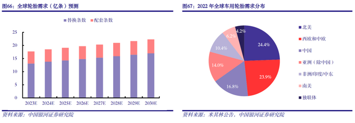 全球轮胎市场空间广阔,预期未来保持稳健增长。2022年全球轮胎总销售额1868.22亿美元,同比增长5.25%,万亿级市场空间非常广阔。从消费类型来看,替换需求占主导地位,约70%以上。从消费区域来看,北美、欧洲、中国凭借较高的汽车保有量成为全球轮胎主要消费区域。据米其林数据显示,2022年全球轮胎消费量17.5亿条,同比增长0.1%。2023年1-9月全球半钢胎、全钢胎配套需求同比分别增长6.0%、2.0%;尽管汽车保有量在增长,但受到高通胀等不利因素影响,轮胎替换意愿不强,1-9月全球半钢胎、全钢胎替换需求同比分别下降1.0%、7.0%。我们认为,轮胎替换需求具有刚性,压制的需求或将延迟释放;随着汽车产销、保有量的稳健增长以及经济修复下轮胎替换需求逐渐改善,2022-2030年全球轮胎需求复合增速有望达到3.2%。
