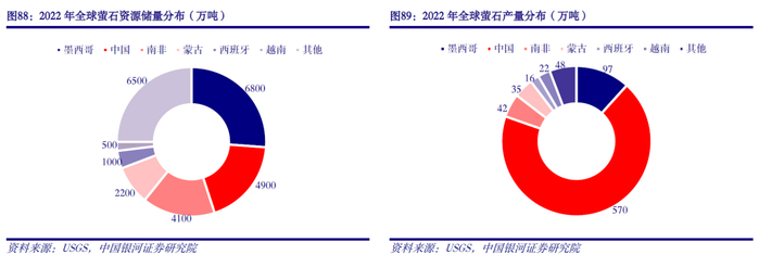 我国萤石保障年限低于世界平均水平。萤石是氟化工产业链的起点,由萤石制备得到氢氟酸,进而可用于生产含氟制冷剂、含氟高分子材料、含氟精细化学品以及氟化盐等。我国是全球第二大萤石储量国、第一大生产国。截至2022年末,我国已探明萤石储量4900万吨(100% CaF2),约占全球萤石总储量的18.85%。2022年我国萤石产量约570万吨(100% CaF2),约占全球总产量的68.67%。从储采比来看,2022年我国萤石储采比仅为8.6,远低于同期全球萤石平均储采比31.3,我国萤石保障年限远低于世界平均水平。