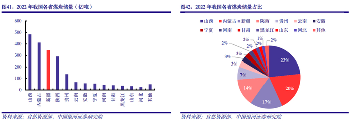 新疆煤炭储量充足、开采成本低。据自然资源部统计数据显示,2022年我国煤炭储量合计2070亿吨,其中山西、内蒙古、新疆和陕西储量分别为483、411、342和291亿吨,占比分别为23%、20%、17%和14%。新疆煤炭资源储量丰富,具有巨大开采潜力。此外,新疆煤炭资源具有煤层厚度大、煤层多、单位面积产能高、地质构造简单、瓦斯等有害气体含量低、地下水少等特点,适合建设大型、特大型现代化安全高效矿井(露天),开采成本低。