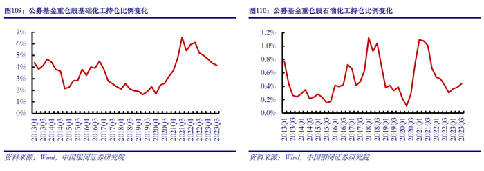 从公募基金重仓持股来看,20Q2以来,公募基金重仓持有基础化工市值占比逐渐提升,21Q3达到历史峰值后震荡回落;23Q3持仓占比4.2%,环比下降0.18个百分点。石油化工持仓占比自峰值下降较大,22Q4达到阶段性低点后,持仓占比逐季增加,23Q3达到0.4%,环比增加0.05个百分点。