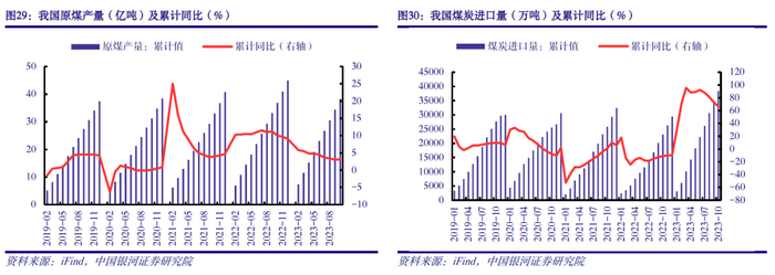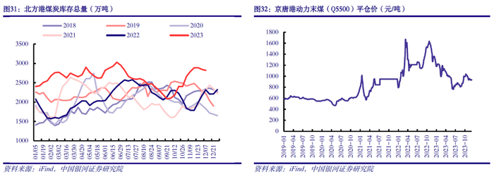 煤炭价格中枢回落,预计2024年延续当前水平窄幅震荡。2023年以来,我国煤炭产量和进口量均有所增长。1-10月我国原煤产量累计38.3亿吨,同比增长3.1%;煤炭进口量累计3.8亿吨,同比增长66.5%。截至12月1日,北方港库存总量为2819万吨,显著高于近些年同期水平;目前京唐港动力末煤(Q5500)平仓价为933元/吨,较年初、去年同期分别回落20.9%、31.1%。我们认为,2024年我国煤炭供需有望维持动态平衡,预计延续当前价格水平窄幅震荡。一方面,煤炭供应增速或进一步回落。国内方面,随着国家保供稳价政策持续推进,国内煤炭总产量有望保持增长;但考虑到非核心区域煤炭产量趋于降低、煤炭安全监察趋严等因素影响,预计国内煤炭供应增速将有所放缓。进口方面,考虑到印尼启用新工作计划和预算体系,导致煤矿产量计划批复时间延长;俄罗斯从2023年10月开始对煤炭出口征收关税,导致进口俄罗斯煤炭成本上升等因素影响,预计2024年我国煤炭进口增速将有所放缓。另一方面,国内经济潜能进一步释放,煤炭消费仍具韧性,需求有望小幅增长。