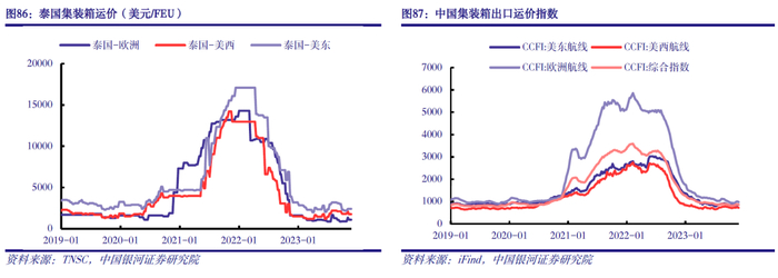 海运费回归正常水平,利好轮胎出口企业。2021年,轮胎海外需求开始修复,但受新冠疫情影响,港口拥堵、船员短缺、集装箱供应不足问题突出,供需失衡下海运费价格大幅上涨,叠加原料成本抬升,行业盈利回落。2022年3月以来,随着海外各国放松疫情管控,港口劳动力供应逐步回升,运转效率加快,拥堵度下降,全球海运费价格自高位开始回落。截至2023年11月25日当周,泰国至欧洲、泰国至美西、泰国至美东海运费分别为1100美元/FEU(40英尺集装箱)、1750美元/FEU和2400美元/FEU,较2022年同期分别变化-31.3%、2.9%和-38.5%,且泰国至欧洲海运费低于2019年同期水平。海运费大幅回落,带来单胎运费的下降,使得中国品牌轮胎在海外市场更具价格竞争力,利好轮胎企业出口提升。