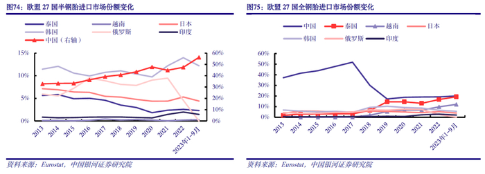 欧美通胀高企偏好高性价比轮胎,中国胎企积极抢占市场份额。在欧美高通胀背景下,消费者消费降级倾向于选择具有高性价比的产品,中国轮胎品牌趁机积极抢占市场份额,中国及以泰国为代表的海外生产基地出口表现亮眼。1-10月,我国新的充气橡胶轮胎出口量51152万条,同比增长10.0%;泰国半钢胎、全钢胎合计出口8998万条,同比增长14.7%。从“结构”来看,国产轮胎品牌积极抢占欧盟市场份额,在美国半钢胎市场份额亦逐步回升。欧盟市场方面,半钢胎主要进口自中国;全钢胎主要进口自东南亚地区,尤其是2018年欧盟对中国卡客车轮胎开启反倾销制裁生效后。1-9月,欧盟进口自中国的半钢胎49.9万吨,同比增长11.8%,占总进口量比例上升至56.2%;同期,欧盟进口自泰国、越南的全钢胎8.3、5.2万吨,同比分别增长2.6%、6.4%,占总进口量比例分别提升至19.3%、12.1%。美国市场方面,1-9月美国进口自泰国、越南半钢胎分别为2559、963万条,同比分别增长3.3%、13.3%,占总进口量比例比分别为21.3%、8.0%,较2022年同期显著提升。在欧美经济下行的背景下,国产轮胎性价比优势凸显,有助于抢占更大的市场份额。