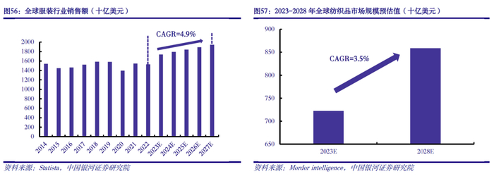 全球纺服消费具有韧性,中长期预计平稳增长。从终端服装消费来看,据Statista报告显示,2022年全球服装市场销售额为15290亿美元,预计2027年将增长至19440亿美元,2022-2027年年均复合增速预计为4.9%。终端服装消费的扩张有望带动上游纺织品需求增长。从上游纺织品消费来看,据Mordor intelligence报告显示,2023年全球纺织品市场规模有望至7226亿美元,预计2028年将增长至8590亿美元,2023-2028年年均复合增速预计为3.5%。纺织服装属于必选消费品,消费具有韧性,中长期需求有望平稳增长。