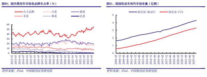 自主品牌乘用车市占率提升,国产轮胎配套需求有望提振。2020年以来,我国乘用车市场呈现自主品牌市场占有率提升,日系、德系品牌市场占有率下降的趋势。主要系自主品牌技术创新带动品质提升,同时产品具有价格优势。2023年10月乘用车自主品牌市场占有率为55.5%,较2019年10月提高17.3个百分点。此外,乘用车自主品牌市占率提升与新能源汽车的爆发式增长有关,目前多种新能源车型配套国产轮胎品牌,玲珑、朝阳、玛吉斯、森麒麟、赛轮、万力等轮胎企业都已经和新能源车企深度合作,国产轮胎品牌有望借助新能源赛道提高配套市场渗透率。