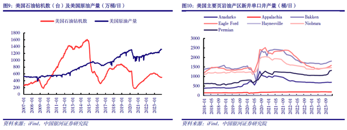 供给端,美国原油产量增速预期放缓,关注OPEC+产量政策执行情况。1)美国方面,2023年以来受益于油井生产效率提升,美国原油产量保持较快增速。在当前“资本纪律”时代,美国页岩油上市公司更加注重股东回报,对狂热的投资保持谨慎。大多数页岩油公司2024年生产目标为同比持平或增速放缓。2)非OPEC国家如加拿大、巴西、圭亚那和挪威的石油产量将继续增长。3)OPEC+方面,需密切关注执行情况及地缘冲突演变。2023年以来,OPEC+多次持续深化减产措施,包括延长减产时间、部分产油国实施自愿额外减产等。从执行情况来看,OPEC方面,1-10月OPEC10国合计月度减产执行率均大于100%;俄罗斯方面,10月俄罗斯原油产量约953万桶/日,较2月下降34万桶/日,低于前期承诺的50万桶/日水平;贸易流再平衡下俄罗斯石油产品出口量暂未受欧盟制裁影响,10月原油出口量约500万桶/日,保持相对稳定。后续建议密切关注OPEC+产量政策、地缘冲突情况等。