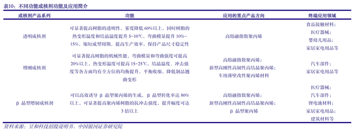 成核剂是一种用于提高聚丙烯等不完全结晶树脂材料结晶度,加快其结晶速率的高分子材料助剂,可改善树脂制成品的光学性能、力学性能、热变形温度等。目前成核剂主要应用在高性能树脂和改性塑料的制造,产品可满足食品接触材料、医疗器械、医药包装、婴幼儿用品、汽车部件、锂电池材料、家居家电用品、建筑材料等行业对产品性能、安全、环保提升的需要。