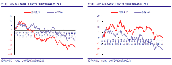 2023年以来,基础化工、石油化工板块波动方向与沪深300大体一致,基础化工受下游需求不佳、价格/价差回落等不利因素影响,向下波动幅度明显大于A股;石油化工在中特估行情下中国石化大幅上涨等因素带动下,收益率高于沪深300。截至12月4日,基础化工累计下跌17.6%,石油化工累计上涨0.3%,分别跑输沪深300 6.6、跑赢沪深300 11.3个百分点。其中,基础化工在30个一级行业中排名26位;石油化工在108个二级子行业中排名48位。
