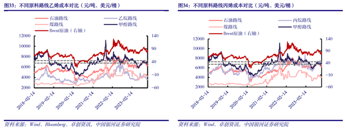 中高油价下,乙烷、煤路线成本比较优势突出。由于生产乙烯、丙烯的原料当前仍以石油为主,占比约在60%-70%,油价将是影响烯烃产业链下游产品价格走势的关键因素。从烯烃生产成本来看,各路线表现不一,乙烷路线和煤路线基本处在成本线最底端。考虑到中高油价下,乙烷路线、煤路线成本比较优势突出,叠加稳增长政策持续发力,我国经济修复进程有望加快,化工品终端需求有望改善,或提振产品盈利水平,我们看好相关企业规划项目逐步投产带来的业绩增量,推荐煤化工龙头宝丰能源(600989.SH)、轻烃加工龙头卫星化学(002648.SZ)等。