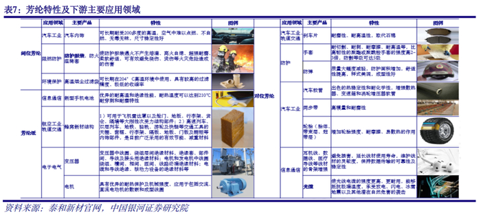 芳纶全称为“芳香族聚酰胺纤维”,是一种新型高科技合成纤维,主要包括间位芳纶(芳纶1314)、对位芳纶(芳纶1414)、杂环芳纶等,具有超高强度、高模量和耐高温、耐酸耐碱、重量轻等优良性能,广泛应用于国防军工、交通运输、电子通讯、轮胎橡胶、安全防护、体育休闲、环境保护等领域。
