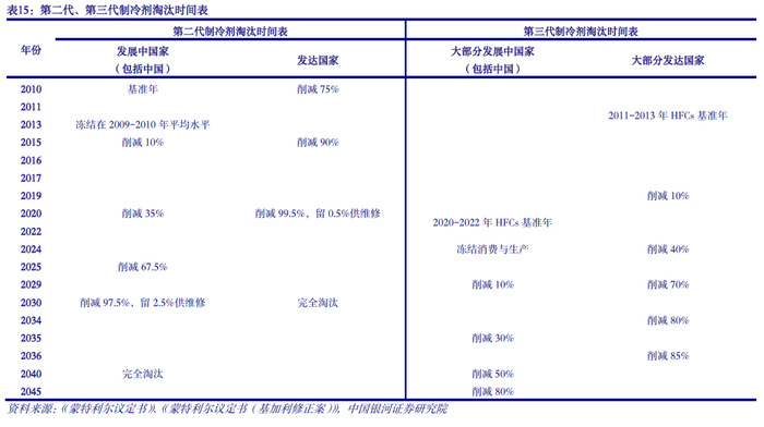 HFCs配额管理方案将于2024年正式实施。相较于二代含氟制冷剂HCFCs,三代含氟制冷剂HFCs不破坏臭氧,是替代HCFCs的主流方案。但由于HFCs全球变暖潜能值较高,在全球环境保护力度加大的背景下,为强化管控非二氧化碳温室气体排放,18种HFCs于2016年被列入《蒙特利尔议定书<基加利修正案>》管控目录。2021年9月,该修正案对我国正式生效。根据《基加利修正案》,我国将以二氧化碳当量(tCO2)为单位,以基线年2020-2022年我国HFCs的平均生产量和使用量为基准,于2024年开始冻结HFCs的生产与使用,并于2029年开始削减HFCs供应。2023年11月6日,生态环境部印发《2024年度氢氟碳化物配额总量设定与分配方案》,确定了我国HFCs生产、使用基线值分别为18.53、9.05亿tCO2,2024年我国HFCs生产和使用总量控制目标将不得超过该基线值。预计各HFCs生产企业2024年生产、使用配额将于2023年第4季度完成发放,我国将于2024年正式开启HFCs配额管理时代。