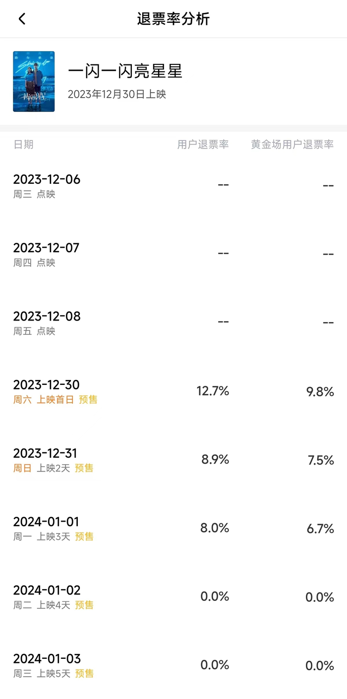 灯塔专业版显示,该电影在淘票票平台的退票率较高,上映首日场次的退票率12.7%,上映次日的退票率为8.9%,第三天退票率为8%,在业内属于较高水平。