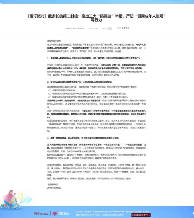 12月8日,《蛋仔派对》官方就近日媒体报道的关于“未成年人冒用成年人账号进行游戏”、“渠道服充值退款难”等问题发表了回应。回应称,《蛋仔派对》已进一步升级健康游戏防沉迷系统,推出三大“防沉迷”举措。数据显示,该游戏已累计完成3万单未成年充值退款申请。