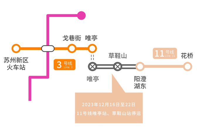 2023年12月16日至22日,11号线唯亭站、草鞋山站临时停运,期间阳澄湖东站至花桥站单一交路运营(晚间大站快车取消),唯亭站至阳澄湖东站将配备免费公交接驳服务;