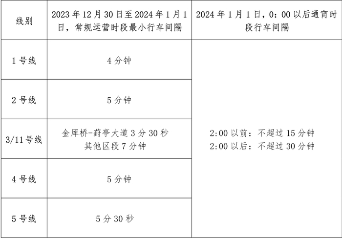 1.元旦跨年夜(2023年12月31日),线网各线路通宵运营。次日2:00以前各线路行车间隔不超过15分钟,次日2:00以后各线路行车间隔不超过30分钟。