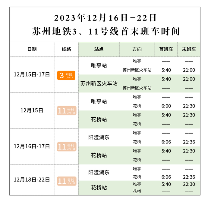 2023年12月15日至17日,11号线提前1小时结束运营,晚间大站快车取消;12月15日唯亭站、花桥站末班车为21:30;12月16-17日阳澄湖东站末班车为21:36,花桥站末班车为21:30;