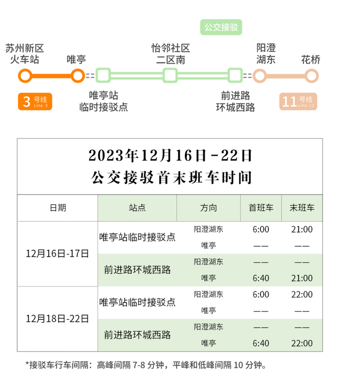 重要提示:上述影响时段,3/11号线各站列车时刻表将提前通过苏州轨道交通乘车APP“苏e行”发布,唯亭站至阳澄湖东站公交接驳单程旅行时间约30分钟,实际受地面交通路况影响会有所偏差,请您提前做好出行规划,感谢您的理解与支持!