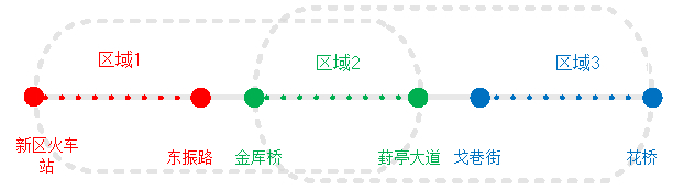 从区域1内车站前往区域3内车站,需在区域2内任意车站下车并原站台等待换乘下一趟列车。