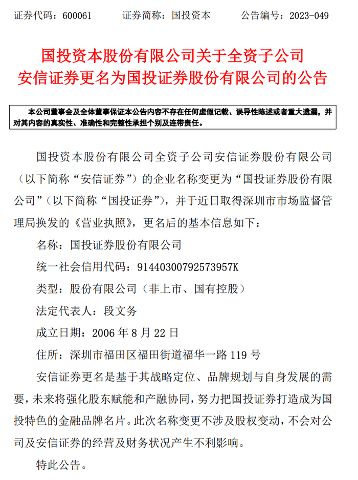 2023年4月,国投集团在战略优化方案中将证券业务列为集团“产业金融”的重要业务单元,是集团的基石业务之一。据了解,此次安信证券更名为“国投证券”既是国投集团战略优化调整的重要一环,也是进一步促进公司作为资本市场专业中介机构在助力国投集团发挥独特功能作用的需要,有利于围绕集团的功能定位,也有利于丰富“国投”品牌内涵以及安信证券和下属子公司在国投全业务链条上的价值互认,实现母子品牌协同效应,形成国投系品牌合力。