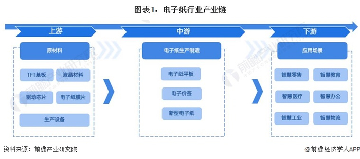 电子纸行业产业链上游包括TFT基板、液晶材料、驱动芯片、电子纸膜片、生产设备等,中游为电子纸生产制造,主要企业包括汉王科技、亚世光电、合力泰等;下游为电子纸产品应用场景,包括智慧零售、智慧教育、智慧医疗、智慧办公等。