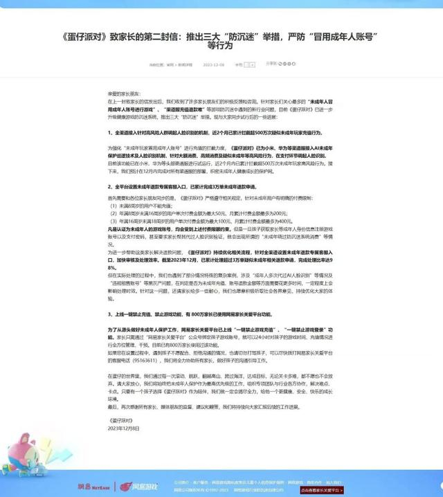 12月8日,《蛋仔派对》官方就近日媒体报道的关于“未成年人冒用成年人账号进行游戏”“渠道服充值退款难”等问题发表了回应。回应称,《蛋仔派对》已进一步升级健康游戏防沉迷系统,推出三大“防沉迷”举措。数据显示,该游戏已累计完成3万单未成年充值退款申请。