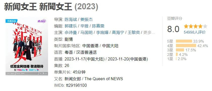 《新闻女王》,就是它与优酷联合出品的首部作品。这部剧于3月开机,11月播出,有粤语、普通话双版本,观众可以自由选择。