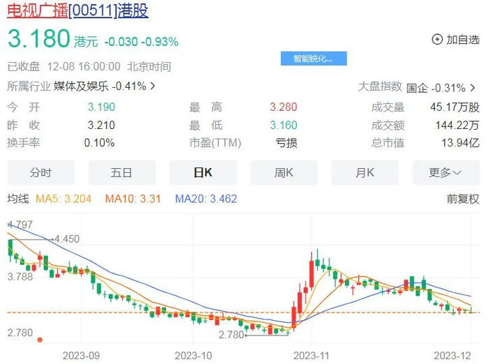 该剧播出21天以来,TVB(香港电视广播)股价累计跌去11%。截至12月8日收盘,市值仅剩14亿港元,相较巅峰时期的220亿港元,缩水93%。