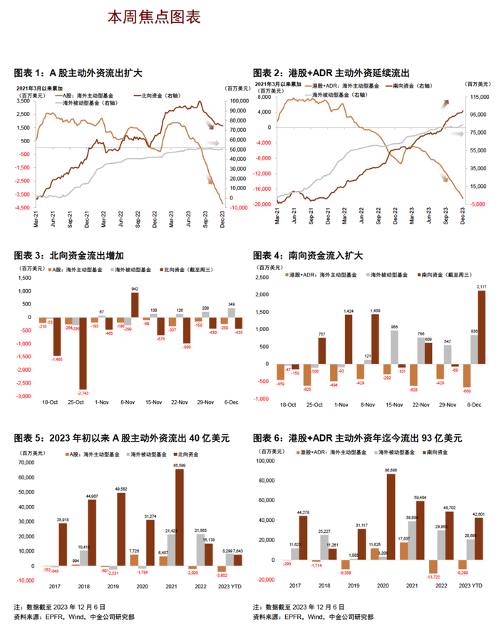 1)我们追踪的EPFR资金数据显示,截至本周三(12月6日),海外主动资金继续流出A股和港股,流出规模再度扩大。